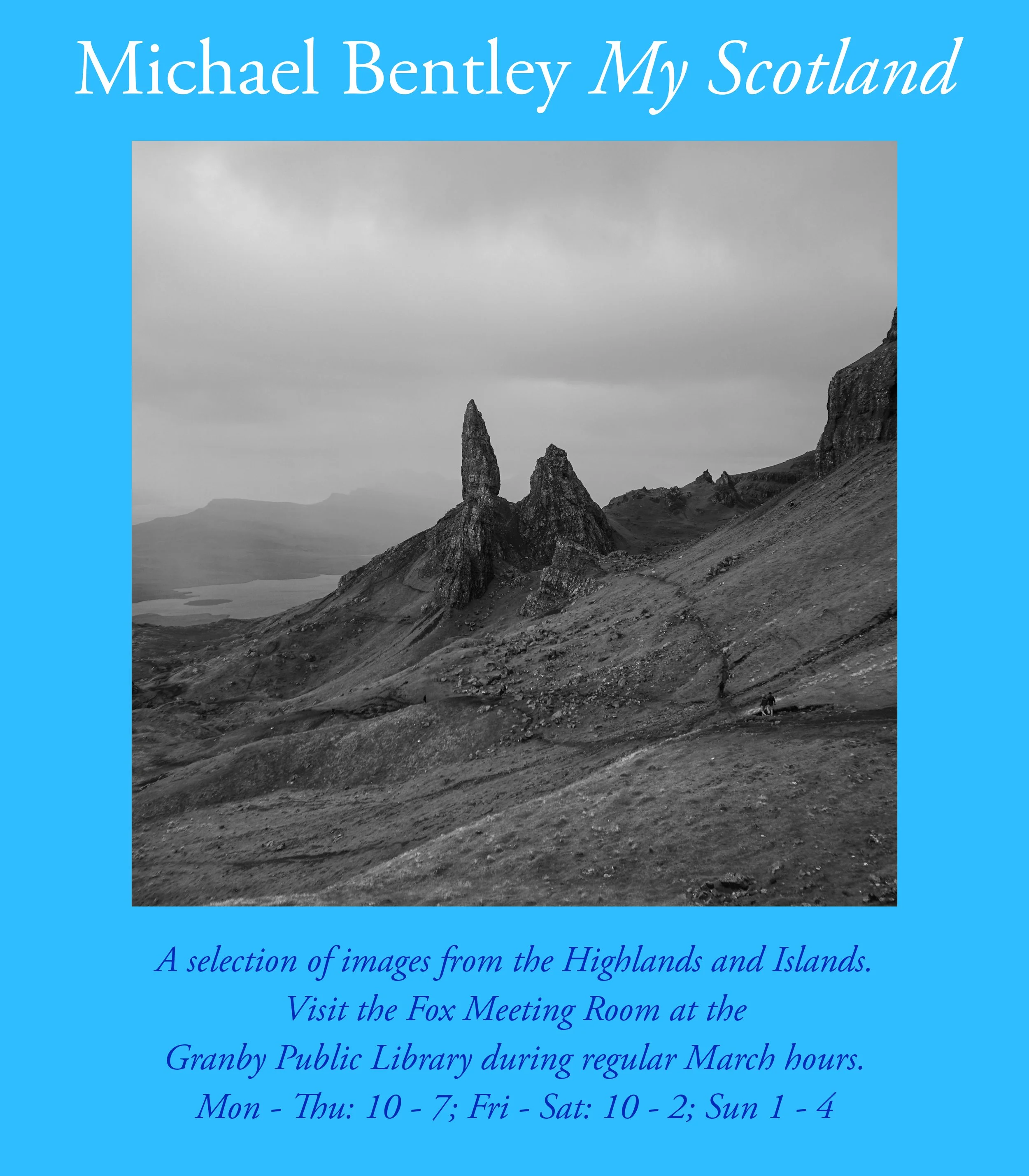 A selection of images from the My Scotland series are on display in the Fox Meeting Room at the Granby Public Library. These photos are drawn from my travels in the Highlands and Islands, and will be on show through March 30, 2026.